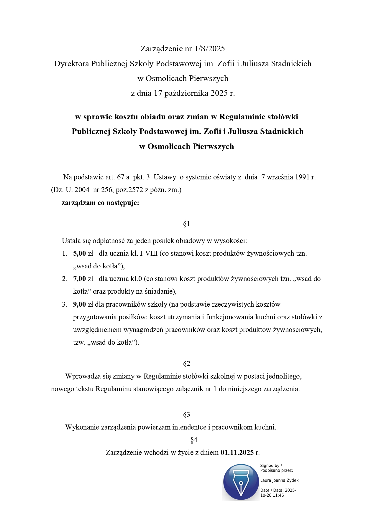 Zarządzenie w sprawie kosztu obiadu oraz zmian w Regulaminie stołówki 17 Paź 2025, PiąData publikacji, 17 Paź 2025, Pią, Aneta GąbkaAutor, Aneta Gąbka, 35Ilość wyświetleń, 35