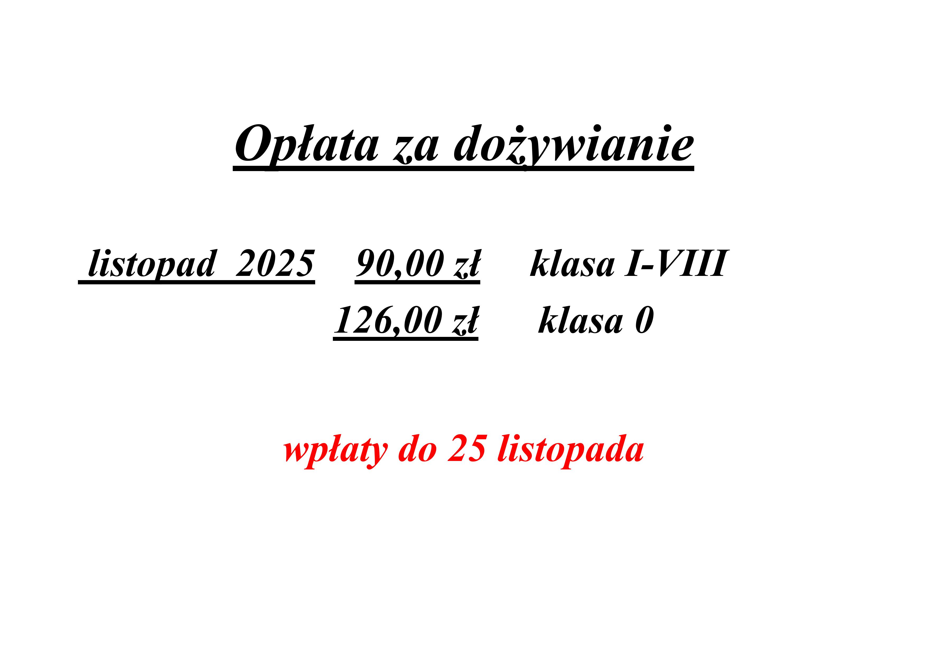 Opłata za dożywianie - listopad 31 Paź 2025, PiąData publikacji, 31 Paź 2025, Pią, Aneta GąbkaAutor, Aneta Gąbka, 11Ilość wyświetleń, 11