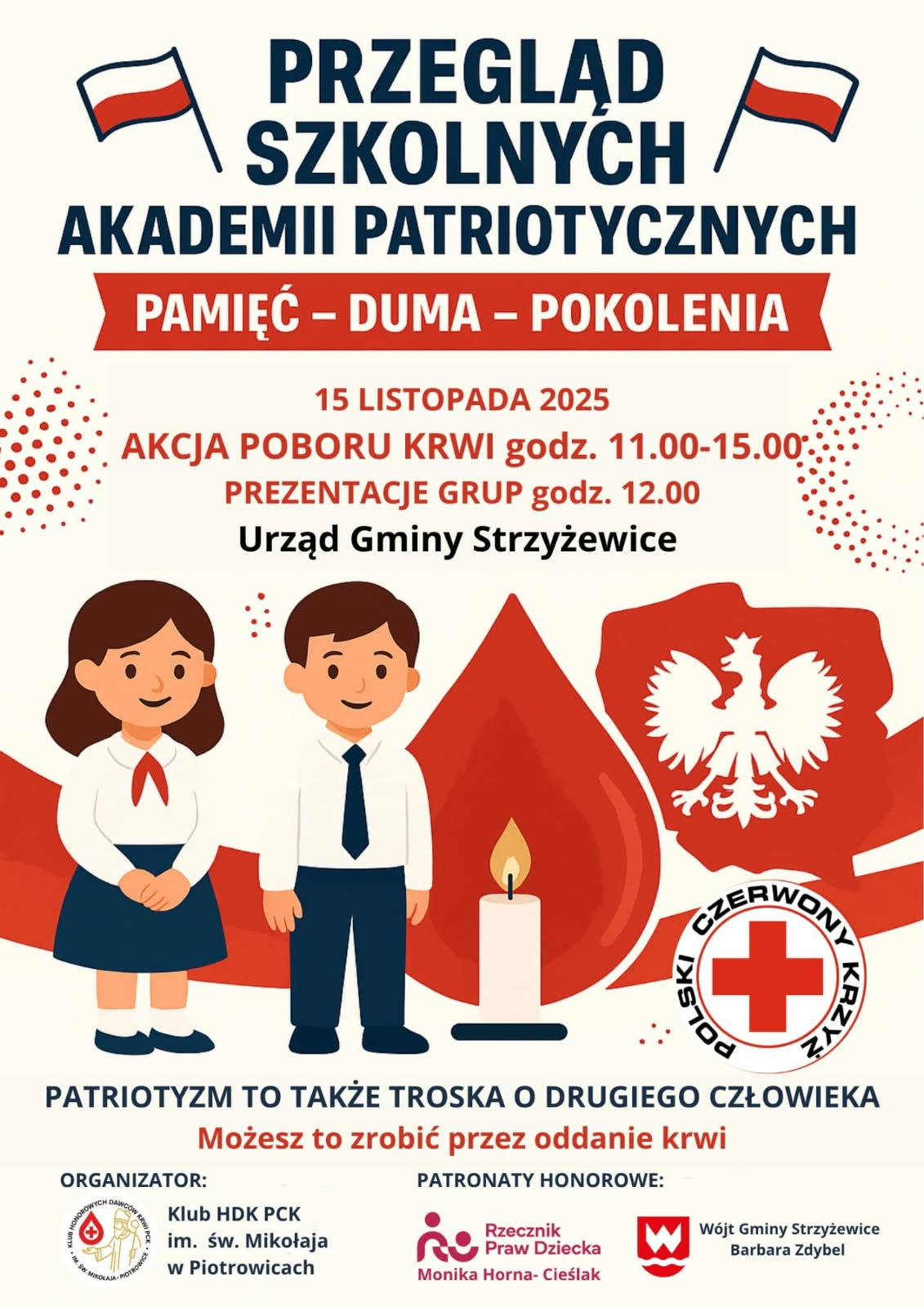 Wójt Gminy Strzyżewice Barbara Zdybel oraz Klub Honorowych Dawców Krwi PCK im. św. Mikołaja w Piotrowicach serdecznie zapraszają na Przegląd Szkolnych Akademii Patriotycznych pod hasłem „Pamięć – Duma – Pokolenia”, połączony z akcją honorowego krwiodawstwa.